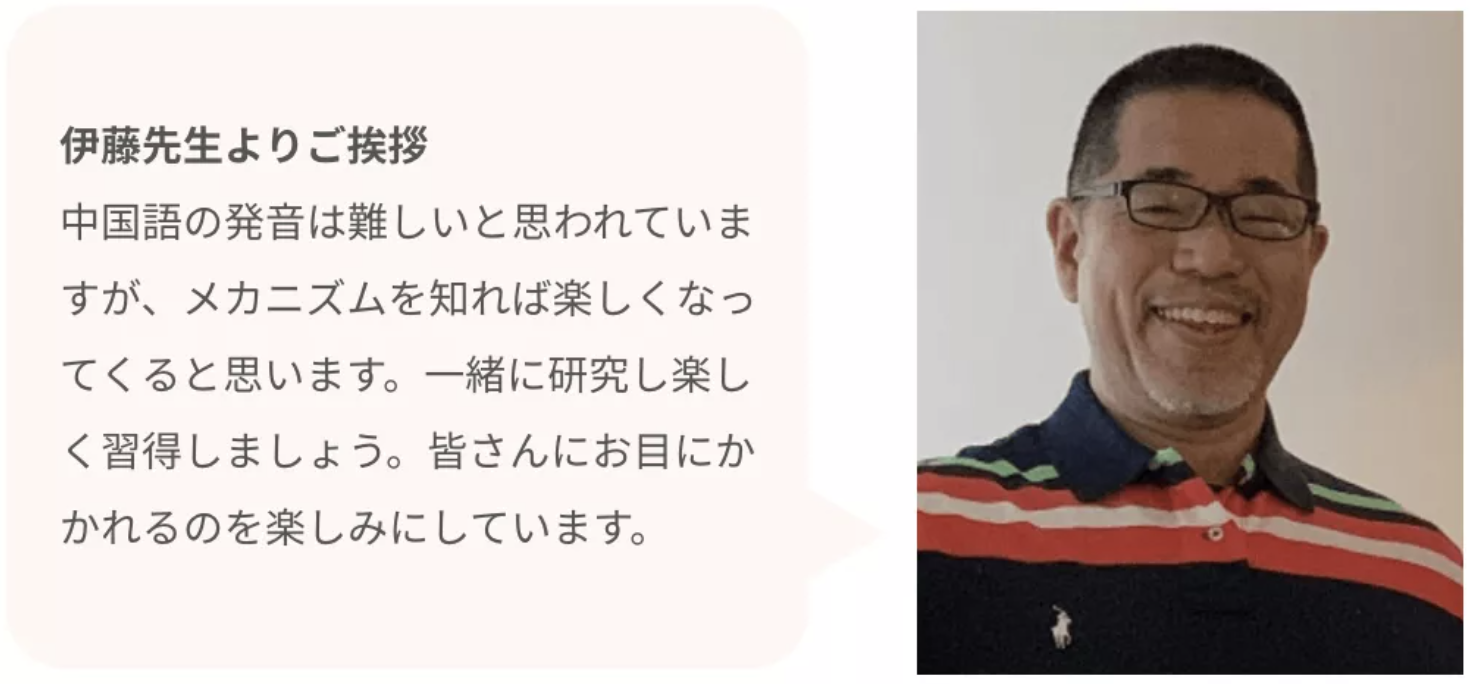 発音の練習は単調に思え、語彙を増やすほうが楽しいのでついつい、そちらに時間を使っており、これまあとは伊藤先生は関西人なのであの真面目さの中にユーモアがあるから受講していて面白いですよね!日本人に教えてもらうと着目点がやはり一緒で、目から鱗、なるほどね、がありますよね。分かりやすいです!中国人は日本人の発音が変だよなと思ってもそれを修正する術がないですからね。その点も伊藤先生の価値かもなって思った次第です。